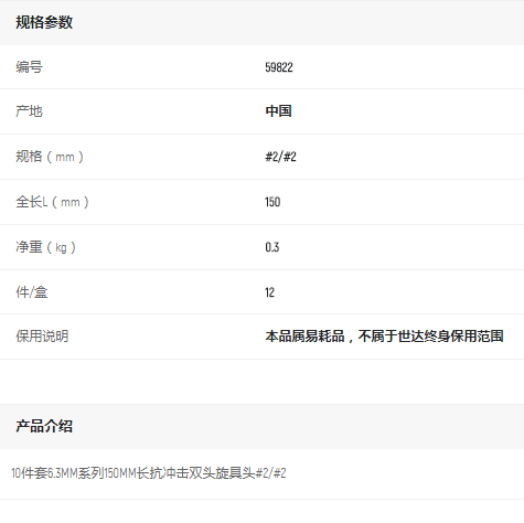 產(chǎn)品名字:世達10件套6.3mm系列150mm長雙頭旋具頭#2/#2