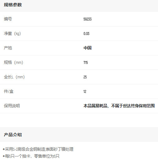 產(chǎn)品名字:世達5件6.3mm系列長花形旋頭T15